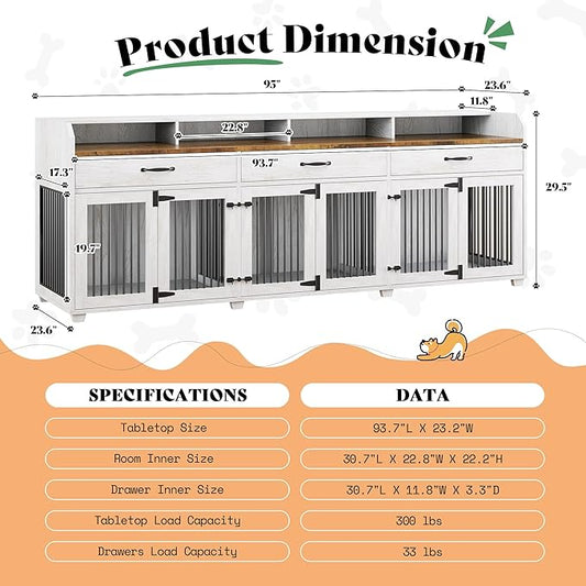 AMERLIFE 95" Large Dog Crate Furniture with Storage, 3-Room Indoor Wooden Dog Kennel for Large/Medium Dogs, TV Stand & Sideboard with Drawers & Removable Divider, White+Barnwood