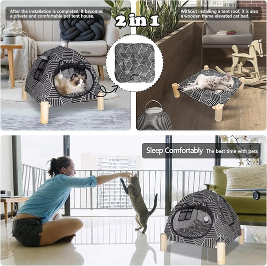 2-in-1 Elevated Cat Tent Cat House, Quick Assembly and Disassembly, Portable Indoor/Outdoor Cute Cat Bed Cave-Black Diamond Pattern