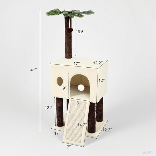 41″ Cat Tree for Indoor Cats Furniture, Cat Tower with Scratching Board, Modern Activity House for Large Cats, Condo with Ball Toys, Kittens Cave, Cat's nest, Beige White