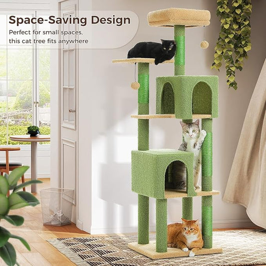 62" Cat Tree for Indoor Cats, Multi-Level Cat Tower for Large Cats with Scratching Posts, 2 Spacious Plush Condos, Padded Perch, Soft Cat Bed, Scratching Pad & 2 Pompoms, Green