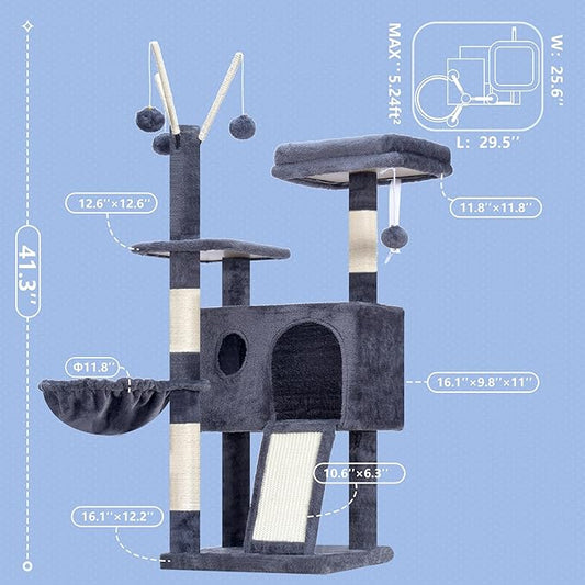 Hey-brother Cat Tree Tower, Scratching Posts with Removable Toys, Cozy Condo, Platform, Hammock, Sisal Scratch Board and Ball for Indoor Kittens, 41.3 Inches, Smoky Gray MPJ008SG