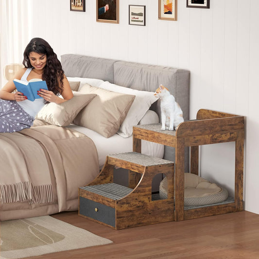 Pet Window Perch with Stairs, Super Large Pet Bunk Bed for Cats, Multi-Level Pet Seat Platform with Mats, Pet Bed Couch with Drawers for Bedside, Home, Indoor Use, Large Size, R