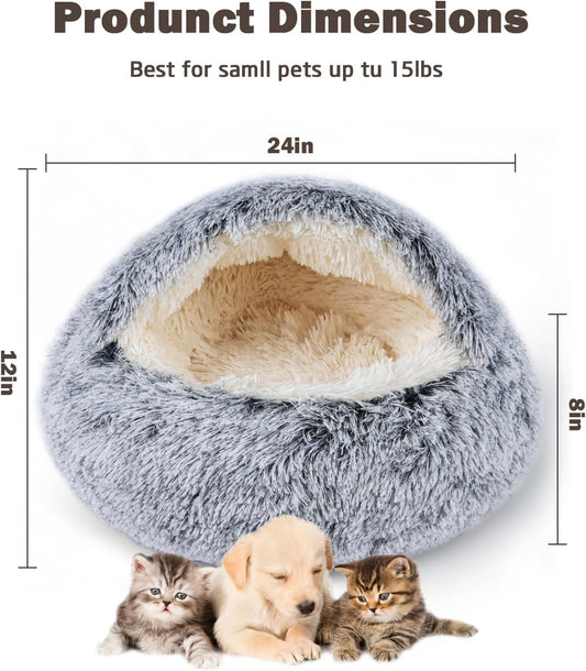 Calming Bean Mush Beds & Cat Cave with Hooded Cover, Removable Washable Round Beds for Small and Medium Pets, Anti-Slip Faux Fur, Fits Up to 15/25 lbs