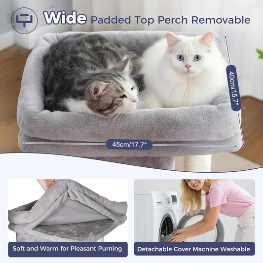 Cat Tree with Large Top Bed 17.7x15.7” Small Cat Tower with Dual Condos,28” Fully Scratching Post and Self Groomer for Indoor Cats-Grey