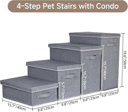 Dog Stairs with Storage, Folding Pet Steps with Zip for Small Dogs and Cats, 4-Step Pet Stairs with Pet House for High Bed, Couch and Car Ramp (Gray, 4 Steps with Condo)