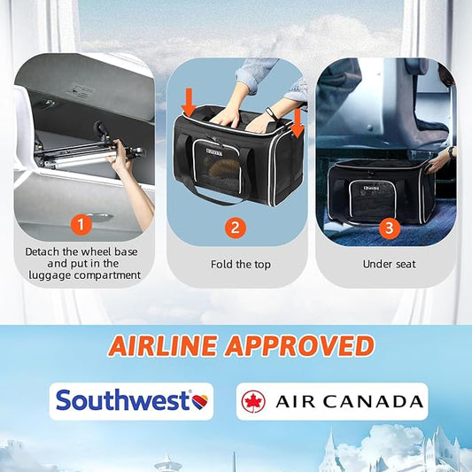 Petskd Top-Expandable Pet Carrier with Wheels 18x13x9.5 Inches Southwest Airline Approved, Soft-Sided Carrier for Small Cats Dogs with Locking Safety Zippers and Anti-Scratch Mesh(Black)