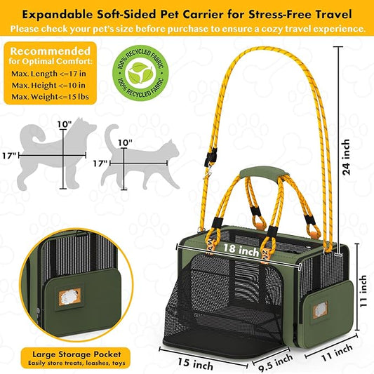 PAWZIDEA Expandable Pet Carrier w/ID Card, 18x11x11 in Small Dog Carrier TSA Airline Approved, Top Load Cat Carrier for 2 Cats Under Seat, Soft-Sided Collapsible Puppy Car Seat Dog Travel Bag, Up 15lb