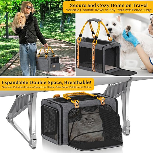 PAWZIDEA Expandable Large Pet Carrier, 24"X16"X16" Top Load Cat Carrier Bag for 2 Cats, Collapsible Dog Travel Crate for Small Medium Dog up 55lbs, Soft-Sided Car Seat Cage, XL Storage Pocket, ID Tag