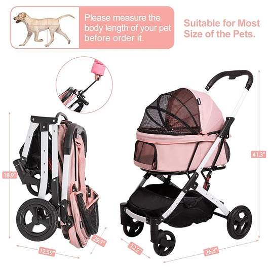 Pet Stroller for Medium Small Dog & Cat, Foldable Lightweight Dog Stroller with Storage Basket Pet Travel Carriage with Safety Leashes, 4 Wheel, Pink