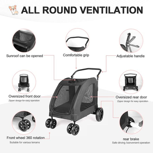 Large Dog Travel Stroller with 4 Heavy Duty Wheels Pet Stroller with Adjustable Handle - Double Doggie Capacity Jogger Wagon with Back Front Door for Small Medium Large Dogs (Black)