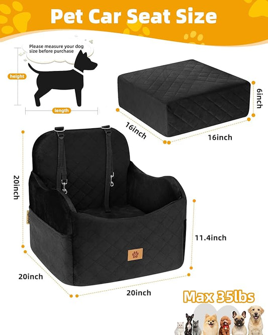 Car Seat Booster for Dog: High-Support Memory Foam Pet Car Seat for Small/Medium Dogs Under 35lbs with Elevated Cushion - Detachable Washable Puppy Travel Bed for Driving with Pockets (Black)