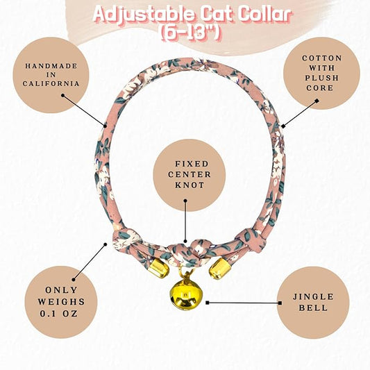 Handmade Cotton Cat Collar with Bell – Adjustable Slip-On Design, No Buckle, Lightweight Rope Collar for Kittens, Indoor Cats, and Small Pets (Petal)