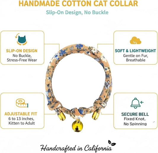 Handmade Cotton Cat Collar with Bell – Adjustable Slip-On Design, No Buckle, Lightweight Rope Collar for Kittens, Indoor Cats, and Small Pets (FAE)