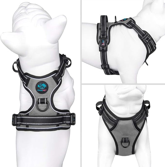 PHOEPET No Pull Dog Harness Reflective Adjustable with 2 Metal Leash Hooks and Soft Training Handle [Over The Head Design](S, Grey)