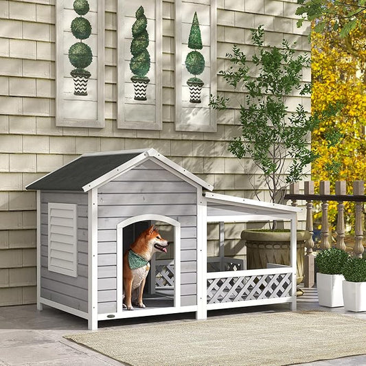 PawHut Wooden Dog House Outdoor with Porch, Cabin Style Raised Dog Shelter with Asphalt Roof, Doors, and Shutter Window, for Medium Large Sized Dog, Light Gray