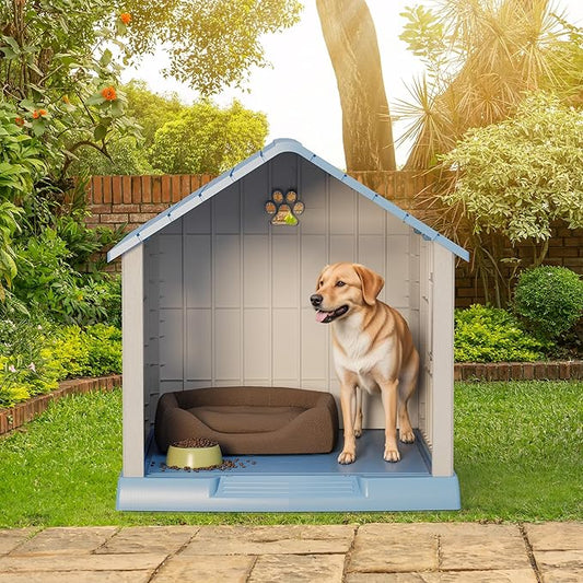 Large Dog House Outdoor Indoor for Medium Large Dogs, Durable Plastic Waterproof Doghouse with Air Vents and Elevated Floor, Easy Clean and Assemble (Blue, 31" L x 33.3" W x 33.5" H)