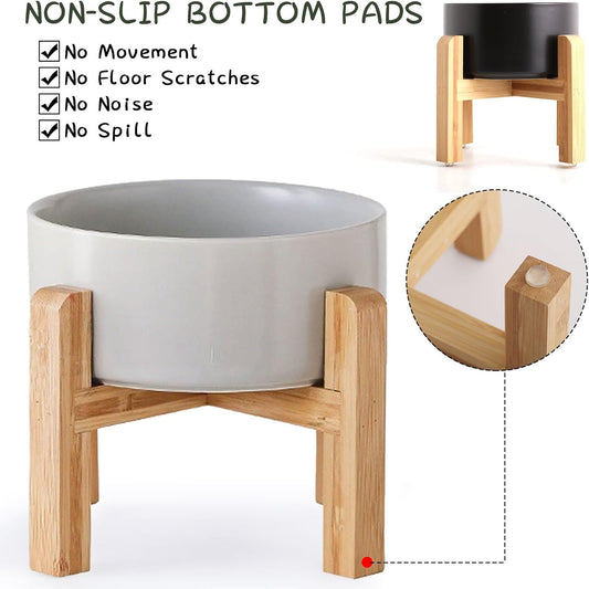 Ceramic Dog Cat Bowl with Wood Stand,Cat Food & Water Bowls Elevated Non-Spill Modern Cute Kitty Dishes Heavy Weighted Round Pet Dishes Set for Small Kitten Grown Cat(Grey)
