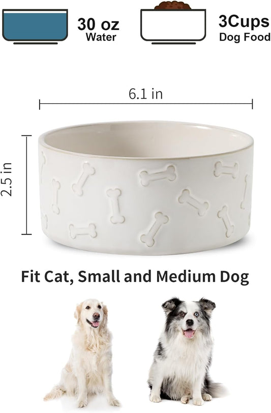 UBEE Ceramic Dog Food Bowl Set of 2, 6.1 inch Dog Bowls Dish with Bone Pattern, Pet Food Water Dish Feeding for Small and Medium Dogs and Large Cat, White