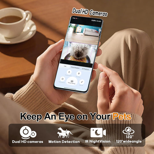 Automatic Cat Feeder with Camera,5G/2.4G WiFi Pet Feeder,2K HD Video and Night Vision,Easy APP Operation,Low Food and Food Clogging APP Tips,Water and Grain Large Capacity Feeder