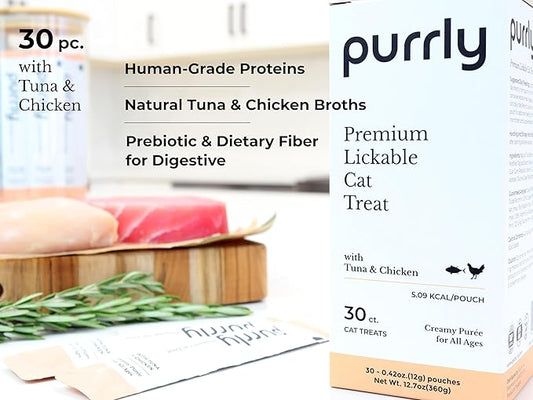 Purrly Cat Treat Topper Lickable Wet Squeezable Healthy Human-Grade Tuna & Chicken Breast with Prebiotic and Dietary Fiber for Indoor Cats (30 Count) Grain-Free Non-GMO No-Preservatives