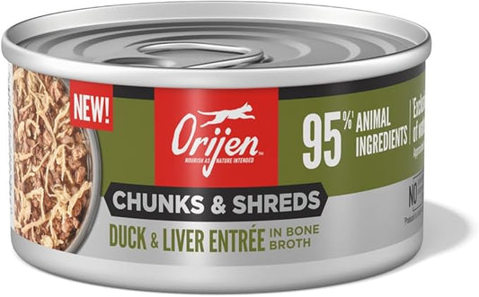 ORIJEN Chunks & Shreds Wet Cat Food Duck & Liver Entrée 5.5oz Cans (6 Count)