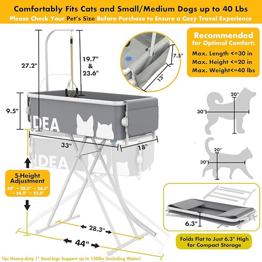 PAWZIDEA 2-in-1 Portable Dog Bathtub & Grooming Table, 33" Foldable Pet Washing Station for Small Medium Dogs Cats, Elevated Tubs for Bathing Shower Indoor Outdoor, 5 Height Adjustable, Storage Pocket