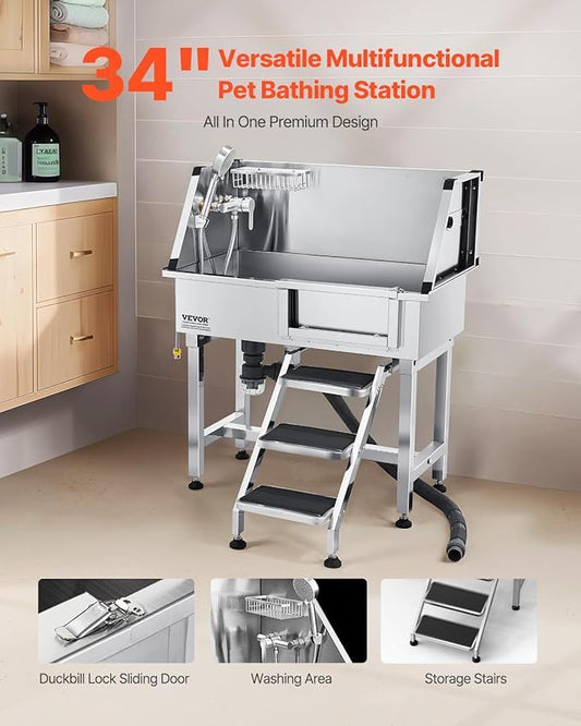 VEVOR Stainless Steel Dog Washing Station, 34 inch Pet Grooming Tub w/Storage Stairs, Faucet & Showerhead & Soap Holder Dog Bathtub, Pet Wash Station for Small Pets (Right Door)
