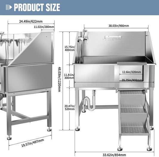 38" Pet Dog Bathing Station W/Ramp, Professional Stainless Steel Dog Grooming Tub W/Soap Box, Faucet,Rich Accessory, Dog Bathtub for Large,Medium,Small Pets, Washing Sink for Home,L-RAMP