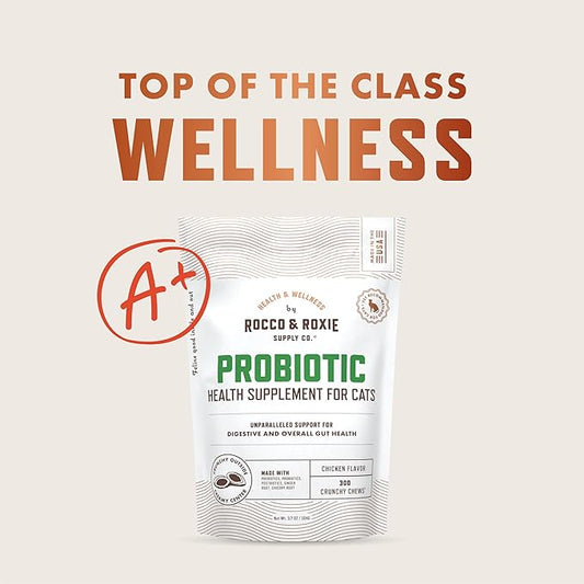 Rocco & Roxie Cat Probiotic Health Supplement for Cats, Prebiotic and Postbiotic for Digestive + Gut Support, Constipation Relief, Anti Diarrhea, Supplements & Vitamins, Chicken Flavored Crunchy Chews