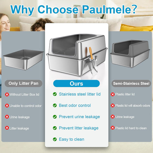 Litter Box with Lid, Stainless Steel Litter Box XL, 14" H Metal Cat Box with High Sides Wall Enclosure, Cat Pan, Non-Sticky, Easy Clean, Anti-Leakage, Black