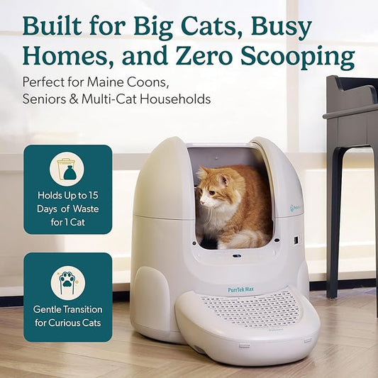 Petcove Self Cleaning Automatic Litter Box for Multi Cat - XL 65L Drum/Ultra Quiet 30-35dB Operation / 5 Safety Sensors/Easy App Control with Ultra Fast 5 GHz WiFi - Includes Ramp & 15 Litter Bags