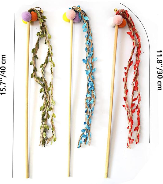 IUHKBH Cat Wand, 3 PCS Soft Wicker Teaser Interactive Kitten Kitty Toy Wooden Hand Cat Stick Toy for Indoor Cats