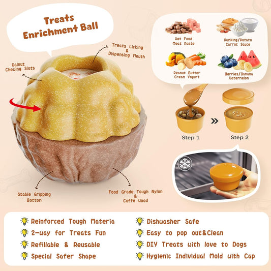 Dog Frozen Treats Toy, Cognitive Dogs Brain Stimulation Toys for Aggressive Chewers, Interactive Dispensing Toy Enrichment Keep Them Busy No-Boredom, Tough Nylon&Coffe Wood Fillable Puzzle Dog Feeder