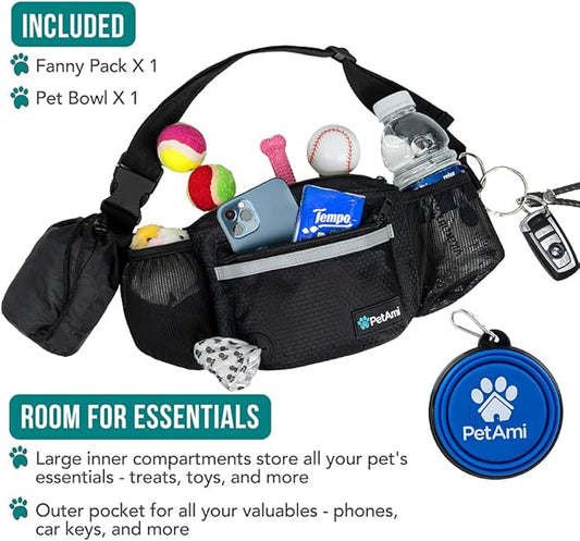 PetAmi Dog Fanny Pack, Treat Pouch for Dog Walking, Training, Built in Poop Bag Dispenser, Water Bottle Holder, Collapsible Bowl, Pet Treat Waist Belt for Hiking, Running, Kibbles (Black)