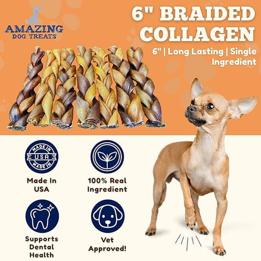 Amazing Dog Treats - 6 Inch Braided Collagen Sticks for Dogs - (10 Count) - Collagen Bully Sticks for Dogs
