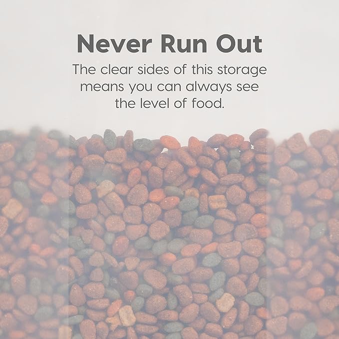 - CLEAR CONTAINER BODY: The translucent body allows you to check the food level in just one glance. Quickly check the remaining amount before you head to the pet store. Designed with a wide top and secure latch for easy opening, scooping and cleaning.