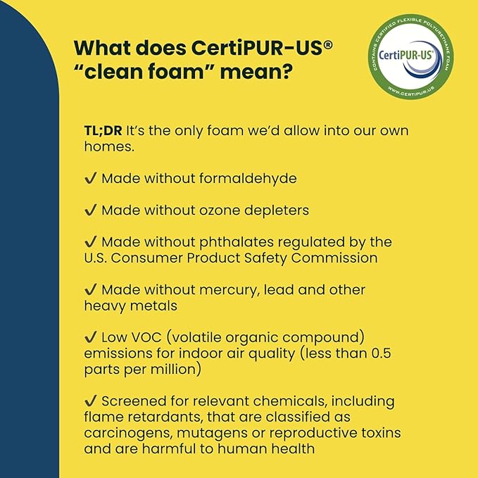 - High Quality CertiPUR-US Certified Mattress: Our foam mattresses are made in the USA, from USA-made foam that has been certified by CertiPUR-US to meet their rigorous durability, content, and emission standards. This foam is made without formaldehyde, ozone depleters, regulated phthalates, heavy metals like mercury or lead, and is low VOC.