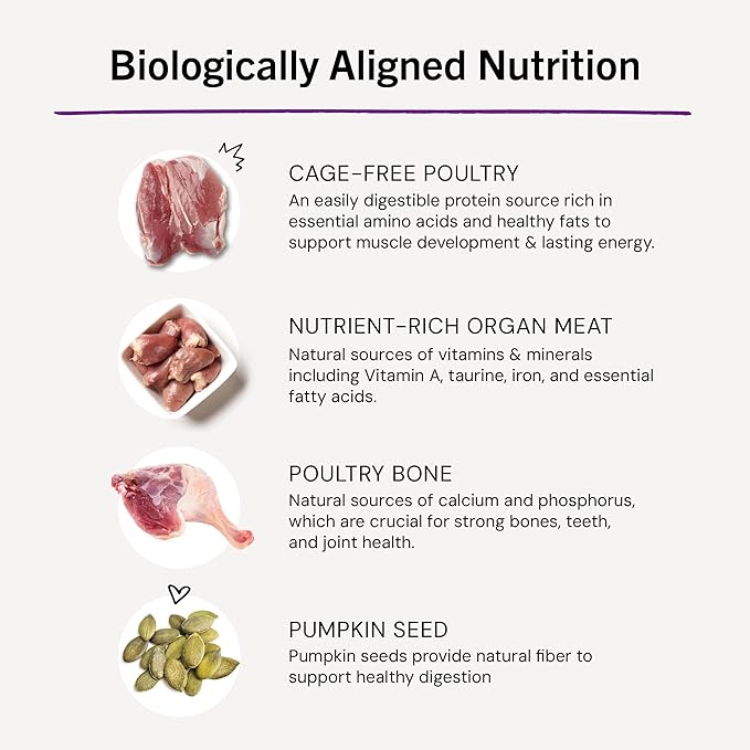 - NATURAL INGREDIENTS YOU CAN TRUST -- Made with responsibly-sourced cage-free poultry and organic ingredients, without artificial preservatives, colors or fillers. Minimally processed to preserve natural nutrients that earn consistent praise from health-conscious pet owners