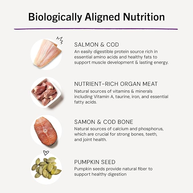 - NATURAL INGREDIENTS YOU CAN TRUST -- Made with responsibly-sourced wild-caught salmon & cod and organic ingredients, without artificial preservatives, colors or fillers. Minimally processed to preserve natural nutrients that earn consistent praise from health-conscious pet owners