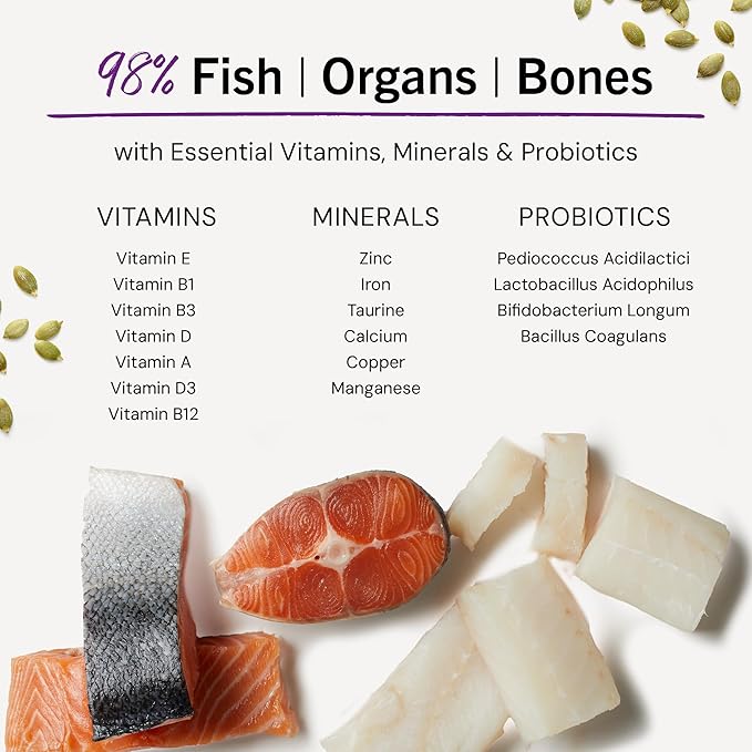 - PREMIUM RAW NUTRITION, CONVENIENT SERVING -- 98% wild-caught salmon & cod, organs & bone provides complete, natural nutrition in easy-to-serve morsels. Feed dry as treats, crumble as a topper, or rehydrate with warm water for a complete meal your cat will devour