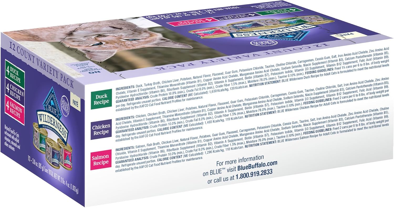 - Contains One (1) Variety Pack of BLUE Wilderness High Protein Grain Free, Natural Adult Pate Wet Cat Food, Chicken, Salmon, Duck 3-oz (12 count- 4 of each flavor)