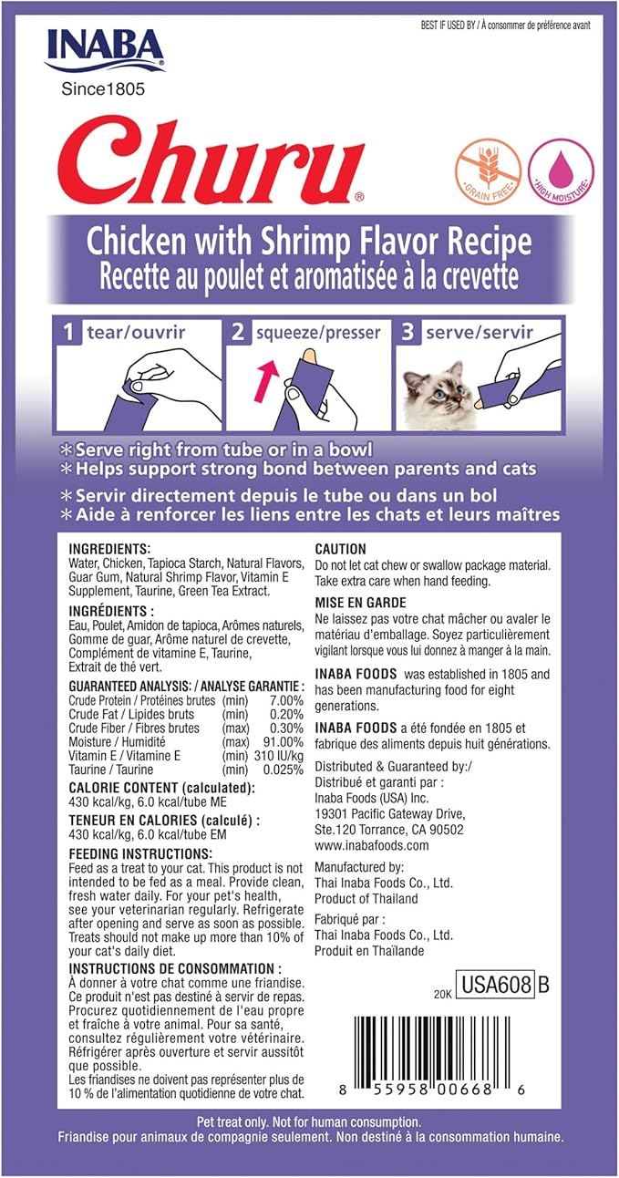 INABA Churu Cat Treats, Grain-Free, Lickable, Squeezable Creamy Purée Cat Treat/Topper with Vitamin E & Taurine, 0.5 Ounces Each Tube, 4 Tubes, Chicken with Shrimp Recipe