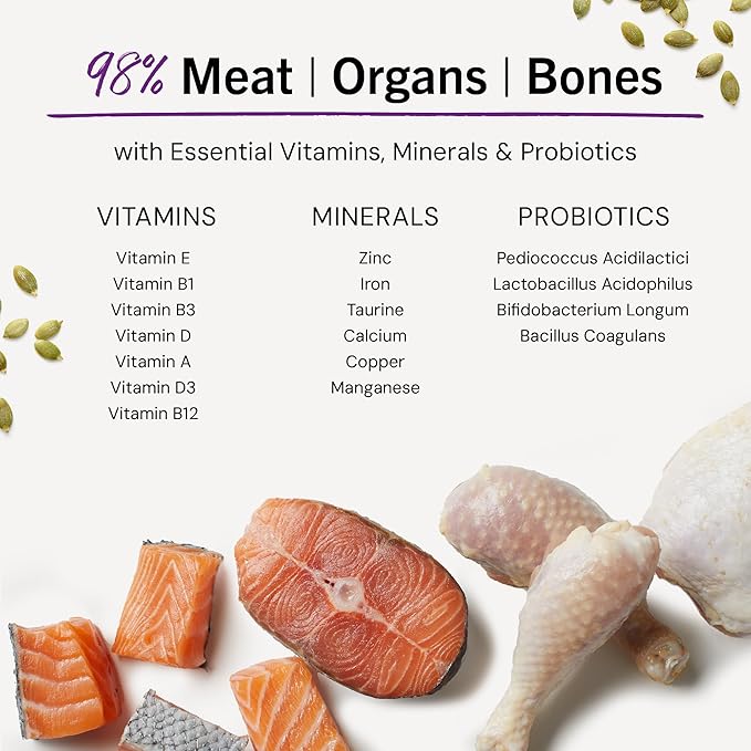 - PREMIUM RAW NUTRITION, CONVENIENT SERVING -- 98% wild-caught salmon, cage-free chicken, organs & bone provides complete, natural nutrition in easy-to-serve morsels. Feed dry as treats, crumble as a topper, or rehydrate with warm water for a complete meal your cat will devour