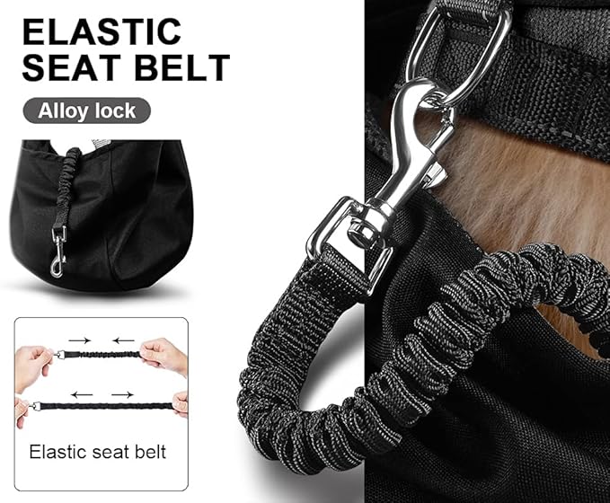 - Double protection device for safety buckle and safety mesh. Apply the harness or collar to the pet to prevent from jumping out suddenly. The safety buckle is connected with the spring rope, which plays a role of buffer and protection when the pet accidentally jumps out of the pet bag and reduces the shock to the pet . The opening of the net is adjustable , and the adjusting buckle is placed on the back of the pet , which is convenient for adjusting and is not easy to hurt the pet .