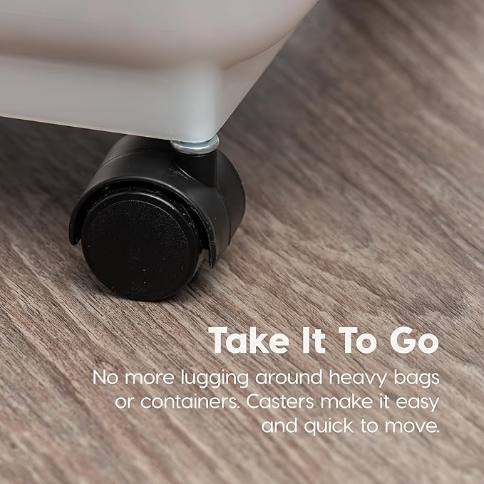 - ROLL IT AROUND: The storage bins come with attachable casters, so you have the option to have them off or on. Store it on a shelf or attach the wheel to roll it from the storage area to your dog or cat bowl.