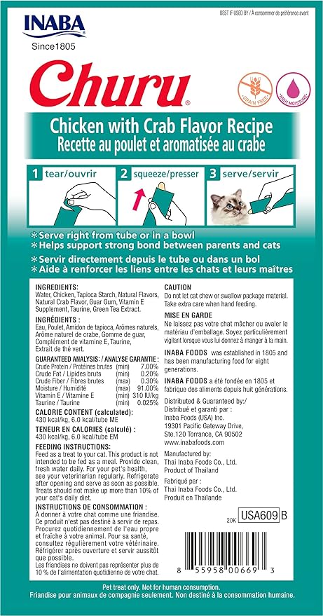 INABA Churu Cat Treats, Grain-Free, Lickable, Squeezable Creamy Purée Cat Treat/Topper with Vitamin E & Taurine, 0.5 Ounces Each Tube, 12 Tubes (4 per Pack), Chicken with Crab Recipe