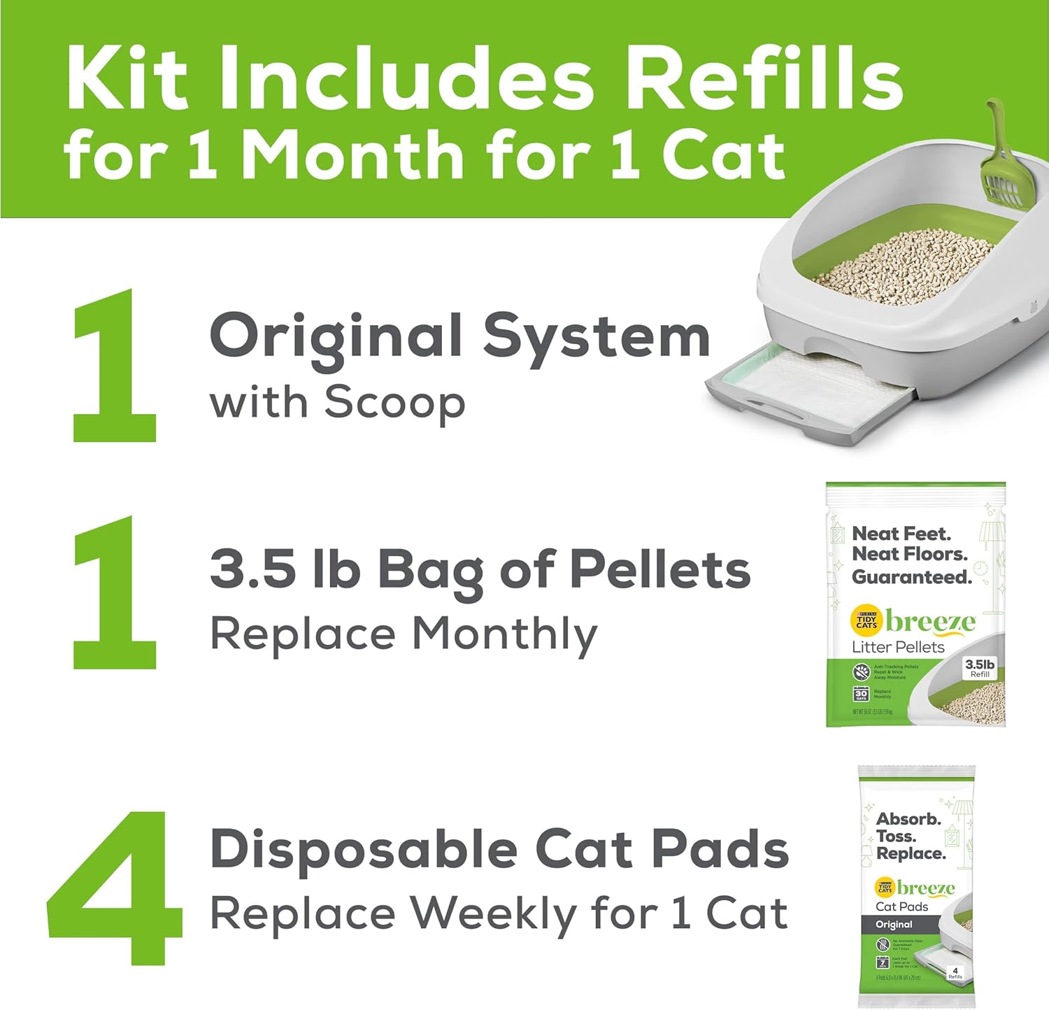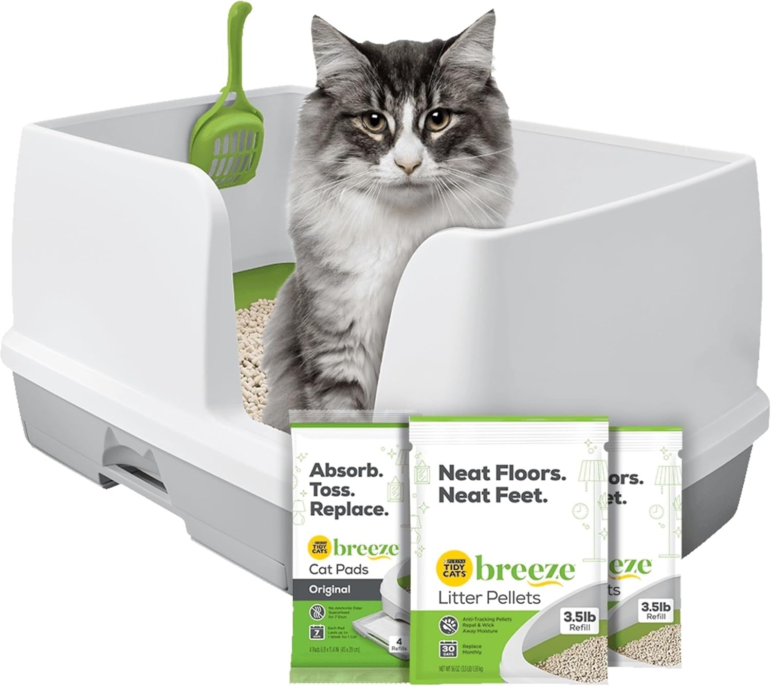 - XL all-in-one odor control and easy-clean multi-cat box including a litter box system with scoop, a pack of 4 litter pads, and 2 bags of 3.5 lb litter pellets, giving your cat a month to fill
