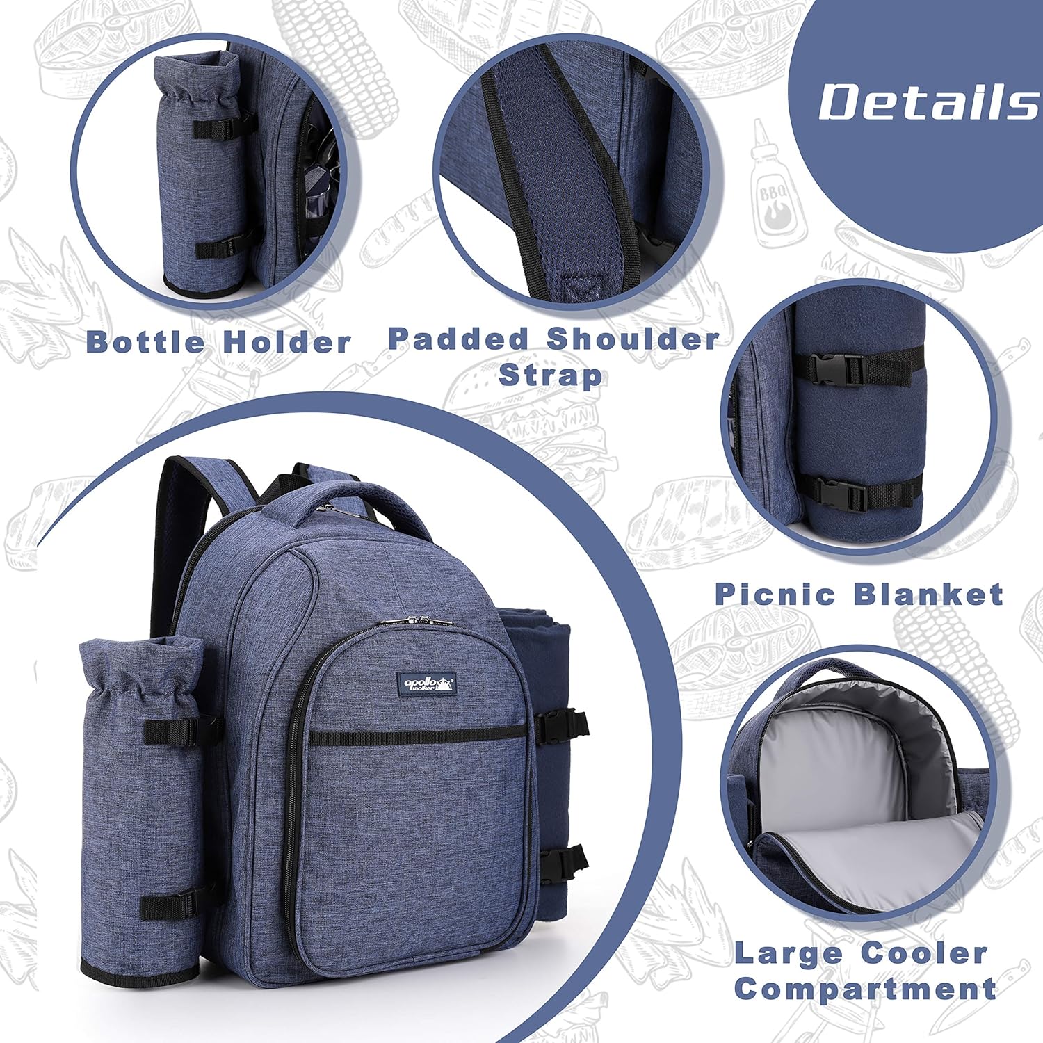Apollo Walker Picnic Backpack Bag for 2 Person with Cooler Compartment, Detachable Bottle/Wine Holder, Fleece Blanket, Plates and Cutlery Set (2 Person, Navy)