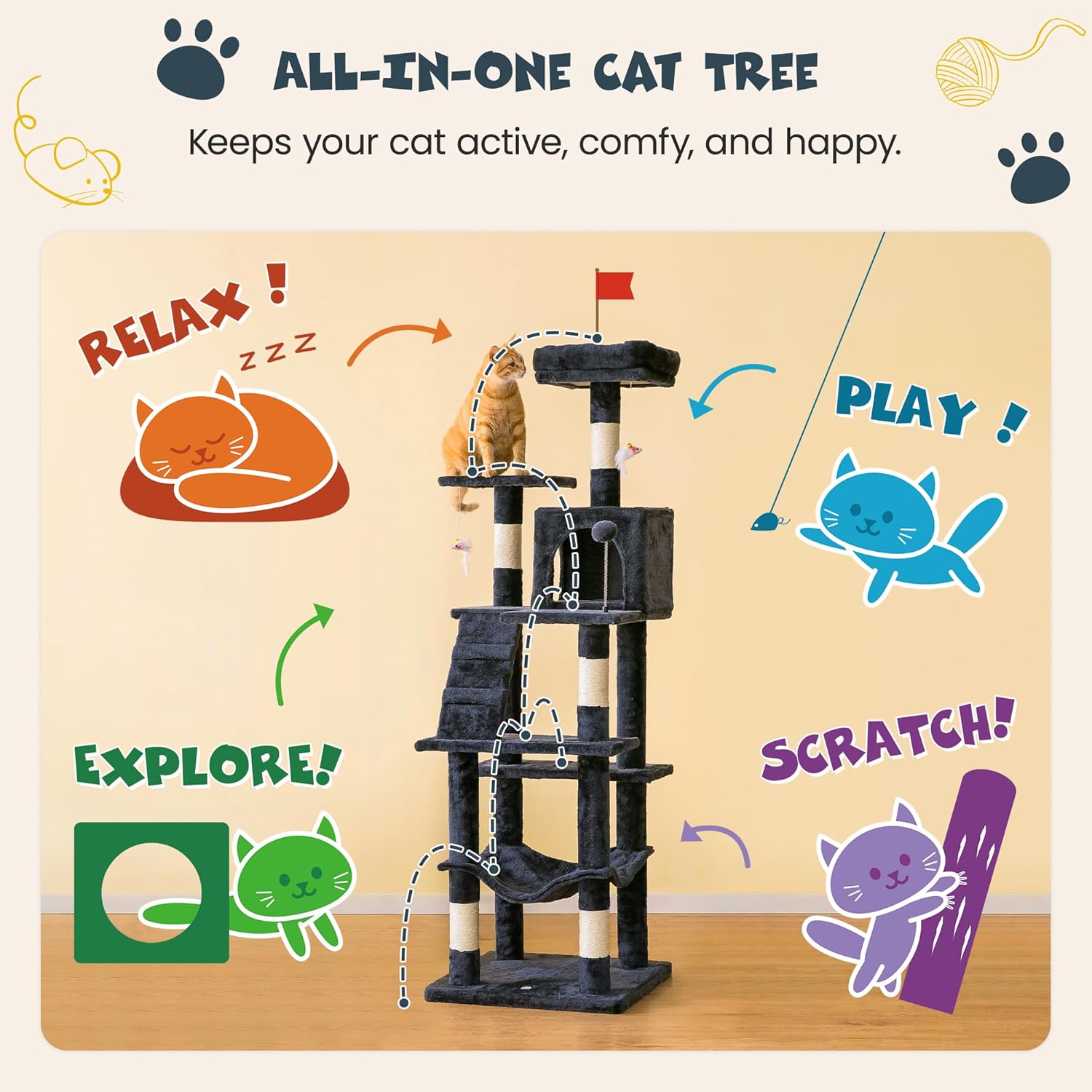 MWPO 63.8 inches Multi-Level Cat Tree for Large Cats with Sisal-Covered Scratching Posts, Padded Platform, Hammock and Condo,Stable Cat Tower Cat Condo Pet Play House-Smoky Gray