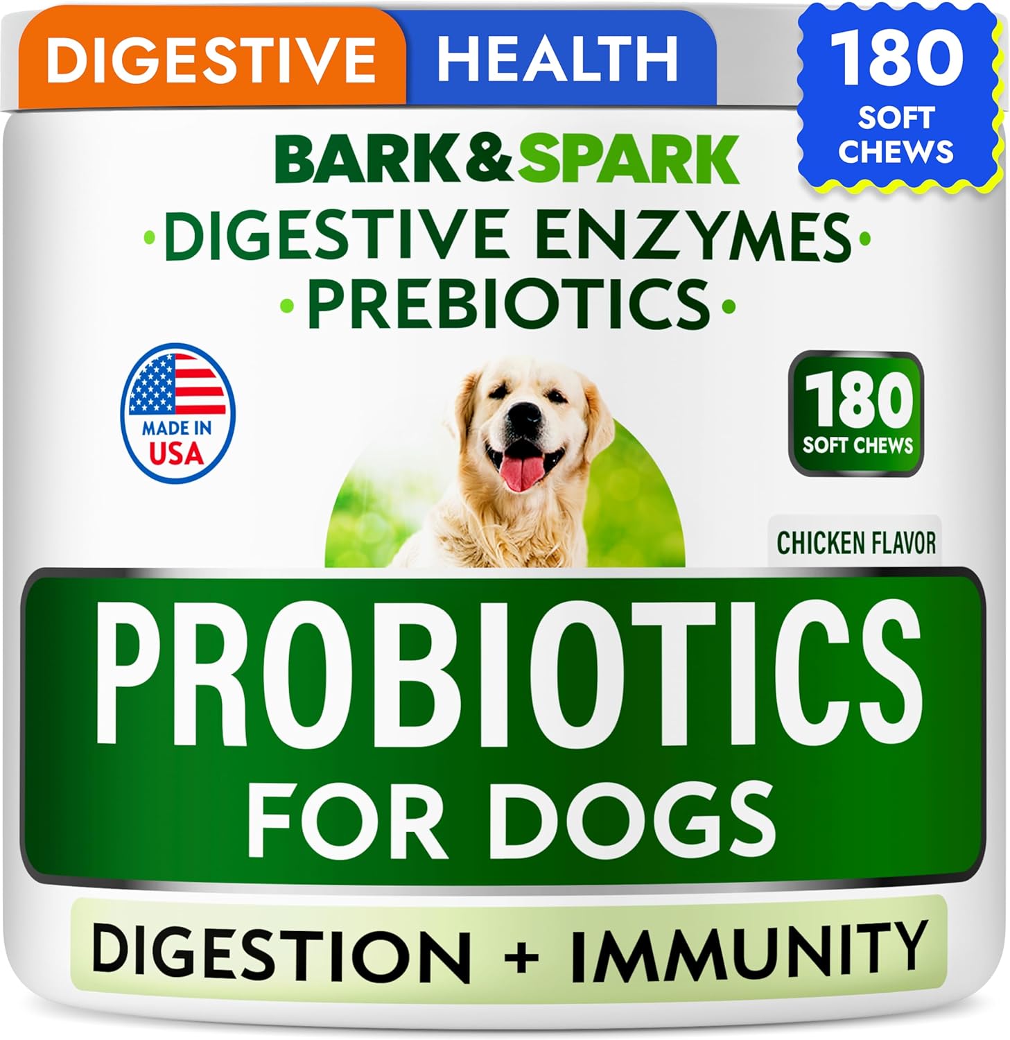Bark&Spark Dog Probiotics & Digestive Enzymes (Gut Health) Allergy & Itchy Skin - Pet Diarrhea Gas Treatment Upset Stomach Relief, Digestion Health Prebiotic Supplement Tummy Treat (180Ct Chicken)